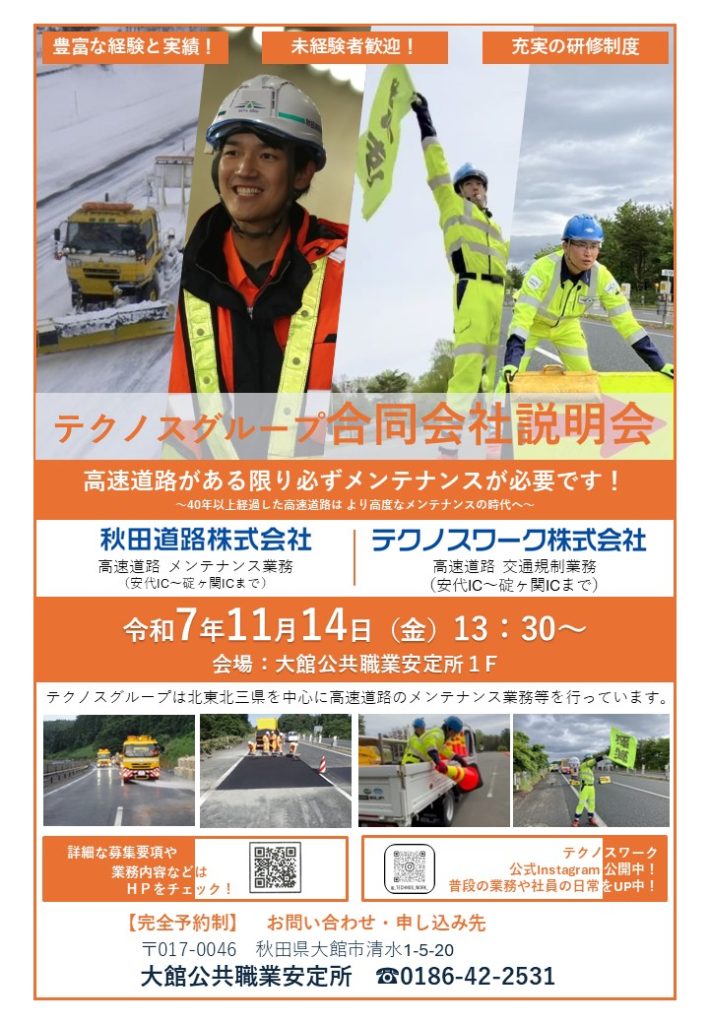 11月14日(金)13:30よりハローワーク大館において秋田道路株式会社及びテクノスワーク株式会社の会社説明会を行います。