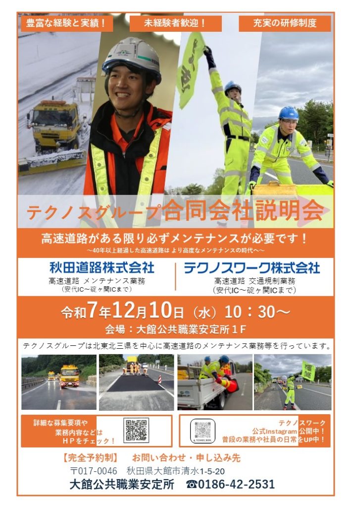 12月10日(水)10:30よりハローワーク大館において秋田道路株式会社及びテクノスワーク株式会社の会社説明会を行います。
