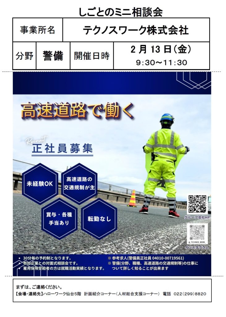 2月13日(金)ハローワーク仙台でテクノスワーク㈱の会社説明会(求職者向け)を行います。